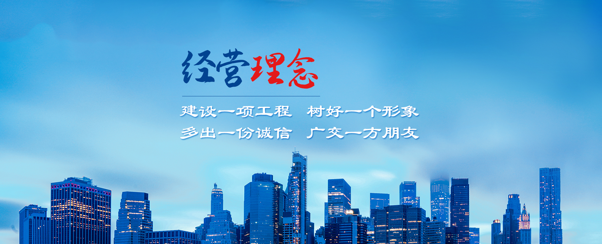 公司以建造合格建筑產(chǎn)品、助力國家建設(shè)為使命,以構(gòu)建幸福企業(yè)為愿景。公司深知助力國家建設(shè)為使命所擔(dān)負(fù)的責(zé)任,故以“如履薄冰、如臨深淵、高調(diào)精細(xì)做事、低調(diào)謙虛做人”為工作理念,建立了完善的管理制度和質(zhì)量保障體系,以人為本,構(gòu)建和諧環(huán)境。公司牢固樹立安全意識、文明意識、質(zhì)量意識、環(huán)境意識和精品意識。在公司質(zhì)量管理過程中貫徹“雙百”方針:即工程合格率100%,客戶滿意率100%。以“建設(shè)一項工程,樹好一個形象,多出一份誠信,廣交一方朋友”為公司經(jīng)營理念。